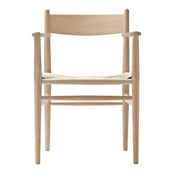 The hand-woven paper cord seat and the gently rounded and flat armrests fixed to the front legs with a distinctive cap provide both comfort and sturdiness. The fascinating design of the CH37 dining chair offers a light and yet sturdy expression to comfortably seat many generations. The chair is also available without armrests as model number CH36.