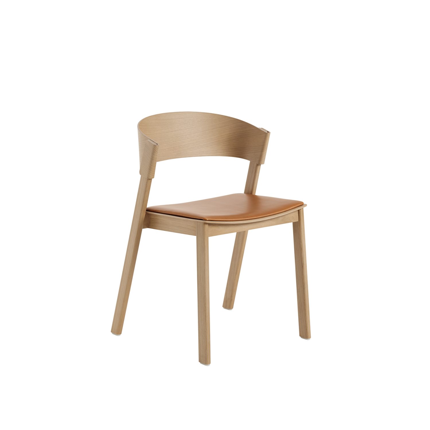 The Cover Side Chair is made in wood with a water-based lacquer, the curved back and seat in veneer and its base and legs in solid oak. The wood is folded around the chair's front legs. This technically innovative wood layering helps lock the elements of the chair together. Available with textile and leather upholstery as made-to-order options.
