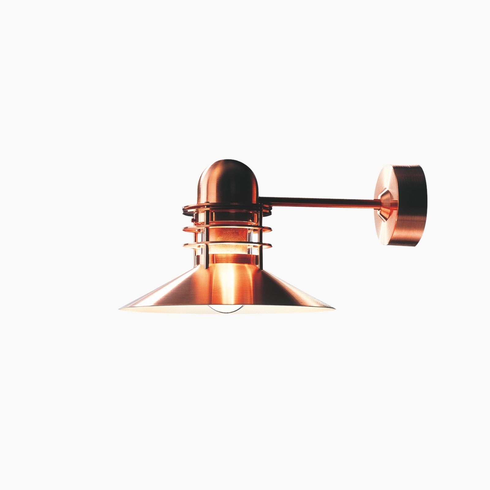 Materials: Shades: Spun aluminum or spun copper. Diffuser: Clear glass. Top: Spun aluminum or spun copper. Mounting Box: Die-cast aluminum. Mounting box cover: Spun aluminum or spun copper. Arm: Copper plated, red brass, or steel.