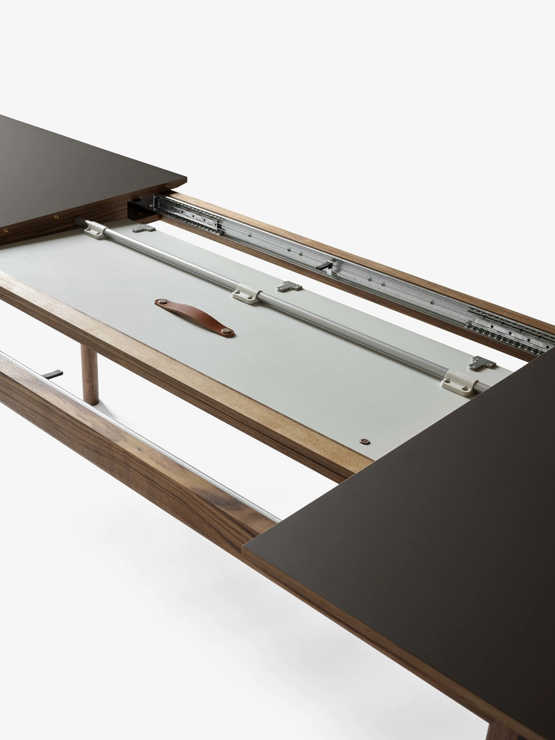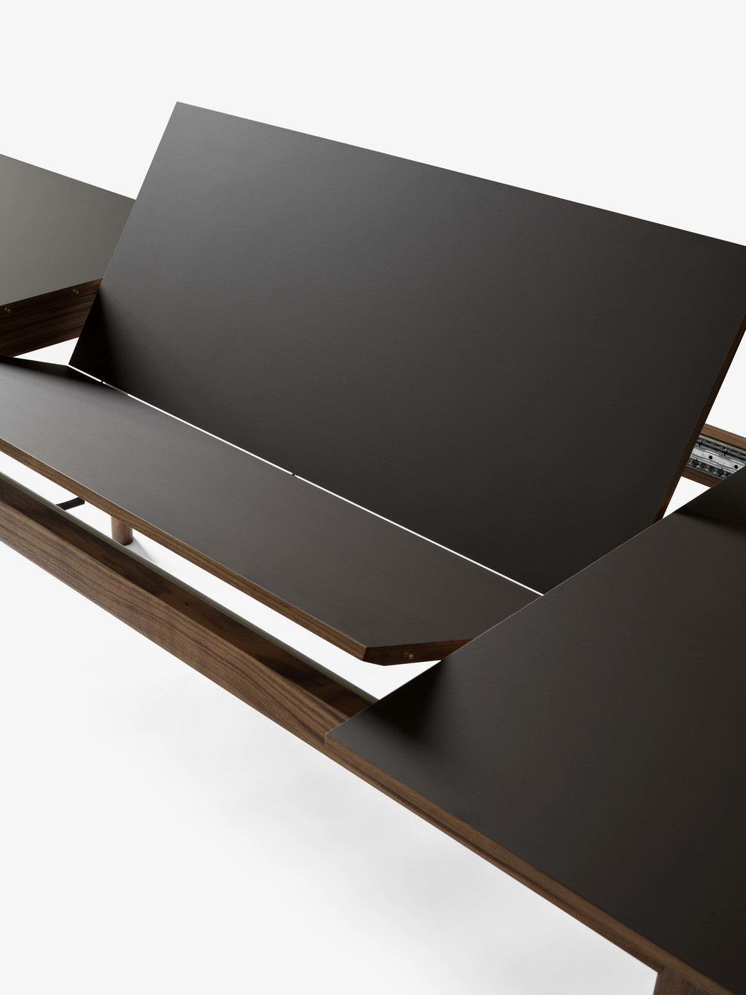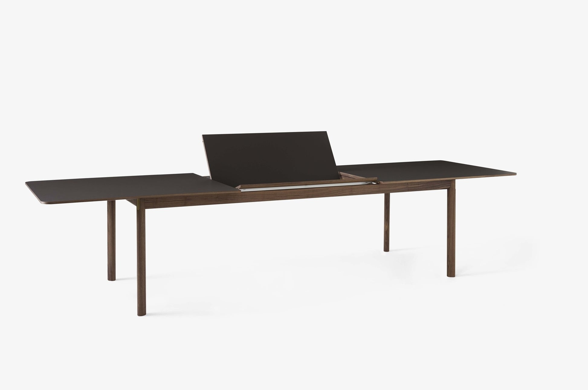 This extendable dining table by Hee Welling employs a butterfly extension technique to provide seating for more people. Its wooden base is topped with a smooth laminate tabletop.