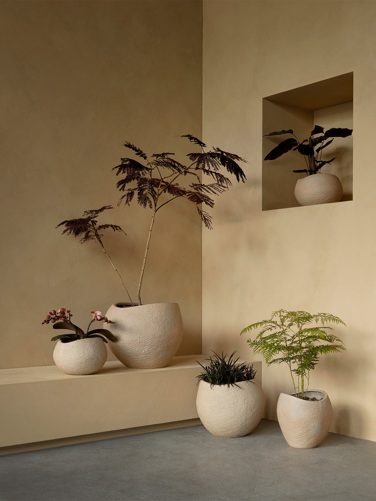Characterized by their curves and irregular, furrowed surface, the Plantas Planters are made from matte ivory stoneware with a textured, natural appearance.