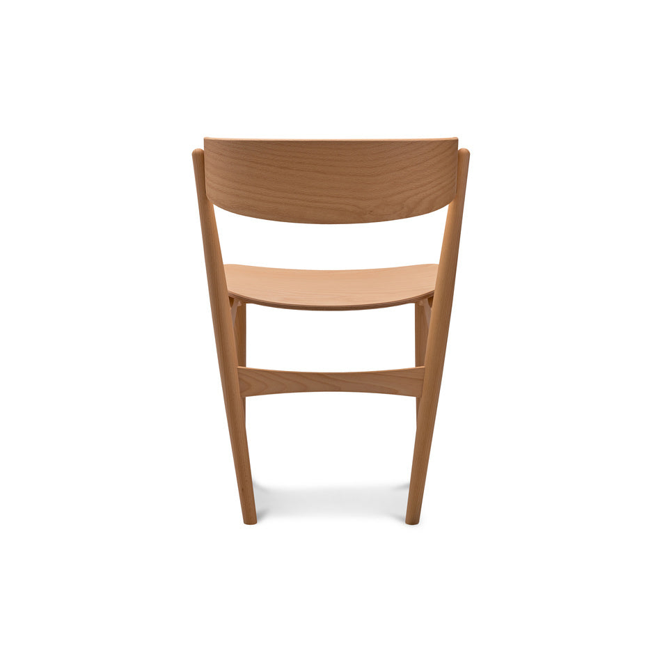 This solid wood chair with its press-molded backrest, floating seat, and slightly narrowed back legs is the second relaunch design by Anna & Ditlev Sibast.
